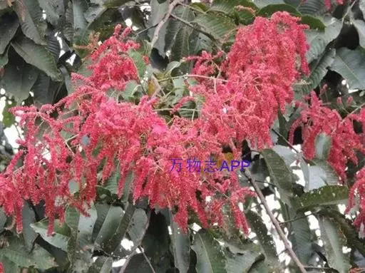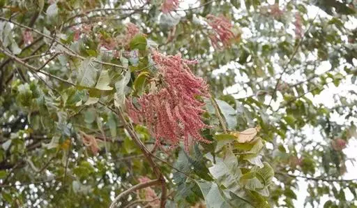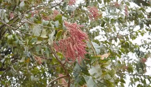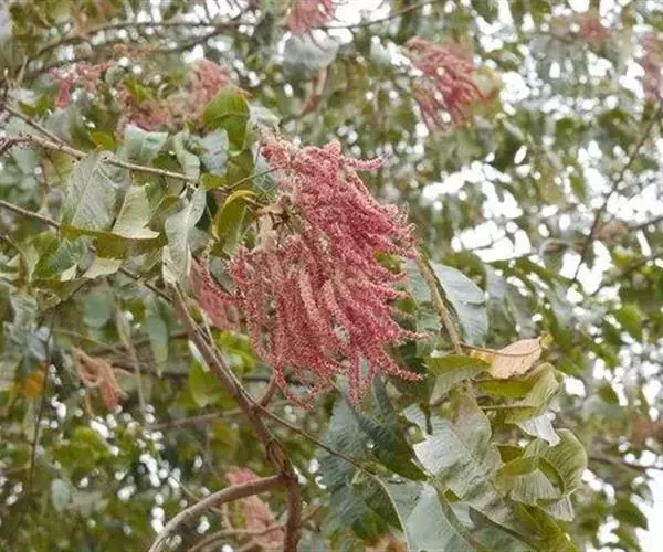 大型圆锥花序,顶生或腋生,长18-26厘米,总轴密被黄色绒毛。花极小,极多数,两性,红色,长(连小花梗)4毫米;小苞片三角形,宿存;萼筒杯状,长2毫米,5齿裂;雄蕊10,突出;具花盘。瘦果细小,极多数,有3翅,其中2翅等大,1翅特小,长约3毫米,宽(连翅)12毫米,翅膜质,干时苍黄色,被疏毛,大翅对生,长方形,小翅位于两大翅之间。花期8-9月,果期10月至翌年1月。