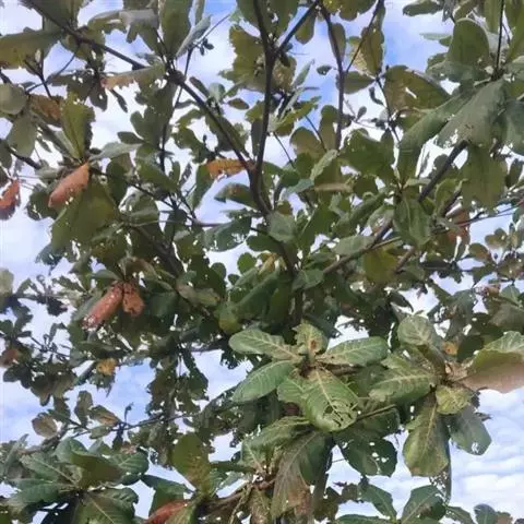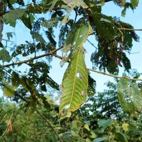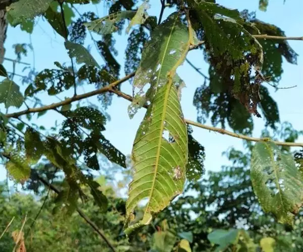 幼林或成林后多出现绒刺蛾、绿黄毛虫和绒毛络瘤蛾等危害,幼虫常群居叶背、取食叶肉,全树甚至大面积危害,严重影响林木的生长,有的由于虫害而导致死亡。防治方法:可选用辛硫鳞50%乳油1000倍液、氰戊菊酯20%乳油3000-4000倍液、功夫(氯氟氰菊酯)2.5%乳油500倍液,每10天喷洒1次,连续2-3次,均能起到较好的防治效果。