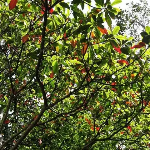 常绿乔木,高达25-35米,具大板根;小枝圆柱状,被褐色短绒毛或变无毛。叶对生,厚纸质;叶片长椭圆形,长10-18厘米,宽5-8厘米,全缘或微波状,偶有粗齿,顶端有一短而偏斜的尖头,基部钝圆,除中脉两侧被黄褐色毛外,其余无毛或近无毛,侧脉15-25对,两面明显,平行;叶柄较粗,长5-15毫米,顶端有一对具柄的腺体。