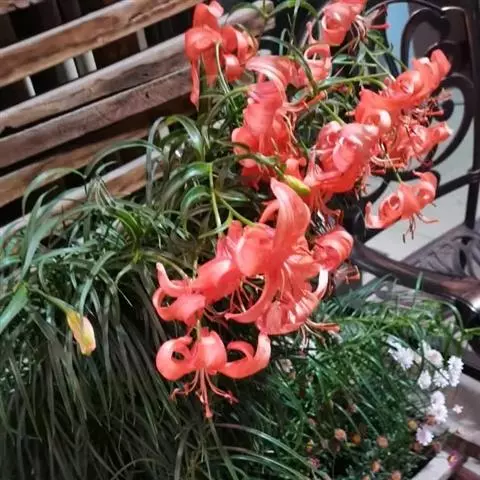 花1至数朵,开放时很香,喇叭形,白色,喉部为黄色;外轮花被片披针形,长9-11厘米,宽1.5-2厘米;内轮花被片倒卵形,先端急尖,下部渐狭,蜜腺两边无乳头状突起;花丝长6-7.5厘米,几无乳头状突起,花药椭圆形,长0.9-1.2厘米,宽约3毫米;子房圆柱形,长约2.2厘米,宽约3毫米;花柱长6厘米,柱头膨大,宽6毫米。花期6-7月。