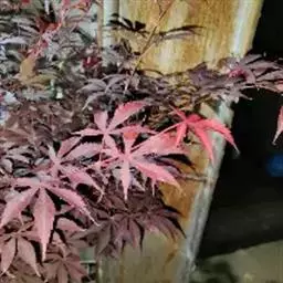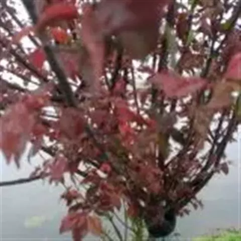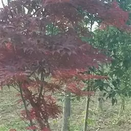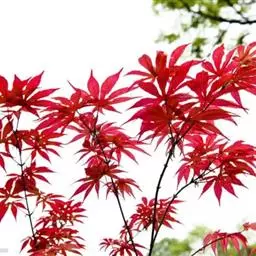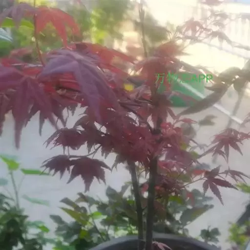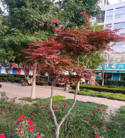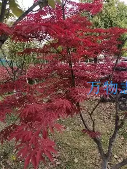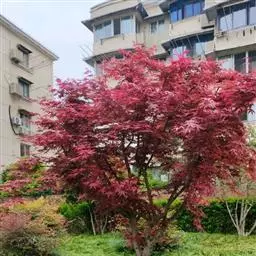 日本红枫又名日本红丝带。被誉为"四季火焰枫"。日本红枫属于槭树科槭树属落叶小乔木或灌木。它的树冠呈扁圆或伞形,掌状5-7深裂,卵状披针形,单叶互生,叶片先端尖锐,叶缘有锯齿。此品种在春、夏、秋三季叶片均为红色,个别品种颜色非常艳丽。夏季随着光照的增强叶体光合作用随之增强,逐渐有变绿的趋势.效果已经不如春季,秋季的时候新叶能够保持红色,但已经发暗,老叶已经变成墨绿色。日本红枫树种较小.一般用做景观绿化用。