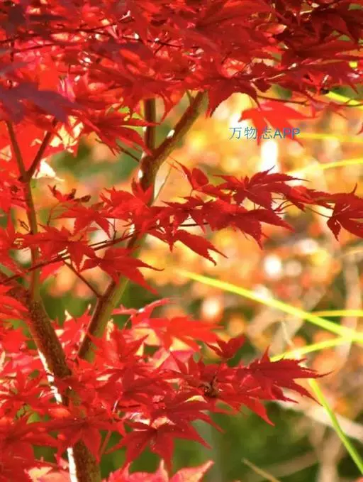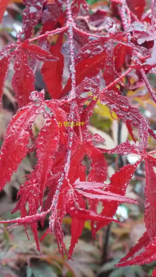 中国红枫又名红叶羽毛枫,为槭树科鸡爪槭的变种,是落叶小乔木,树高达9米。它枝条光滑细长,单叶5—7裂,掌状互生,叶片长椭圆形至披针形,叶缘有重锯齿,幼枝、叶柄、花柄都为红色。花紫色,伞状花序顶生,花期5月。翅果无毛,10月成熟。