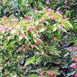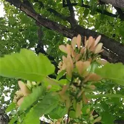 春、秋季叶红色,夏季叶紫红色。嫩叶红色,老叶终年紫红色。伞房花序,顶生,杂性花。花期4-5月。翅果,幼时紫红色,成熟时黄棕色,果核球形。果熟期10月。