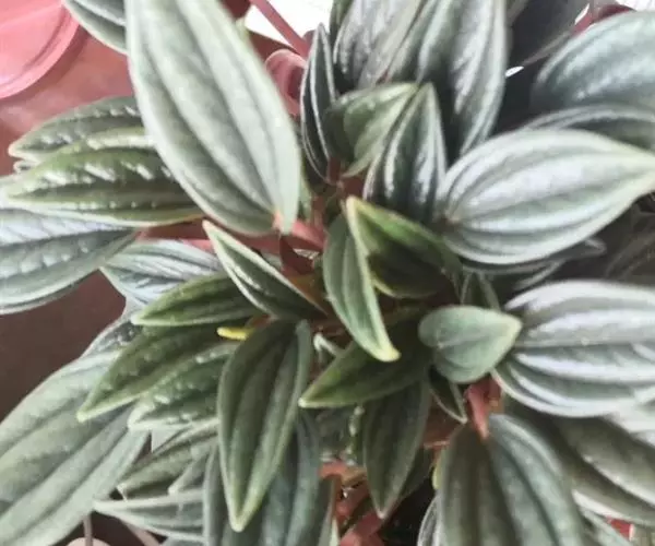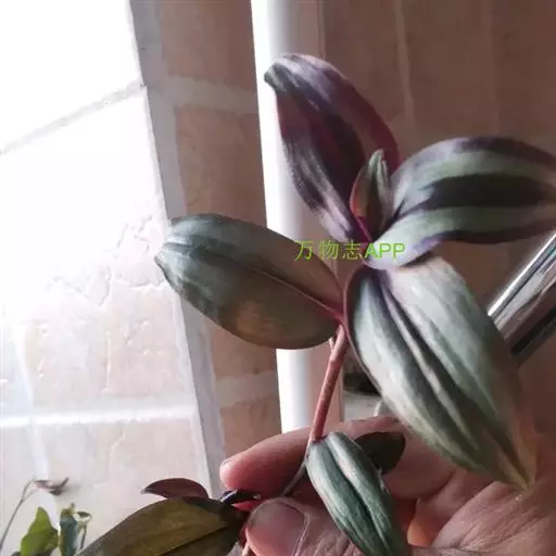 叶互生,无柄,椭圆状卵圆形或长圆形,先端尖锐,基部钝,全缘,长5-7厘米、宽3-4厘米;表面紫绿色或杂以银白色条纹,中部和边缘有紫色条纹,叶背紫红色;叶鞘长0.8-1.2厘米、宽0.5-0.8厘米,薄,膜质,长在节嘴具缘毛,或无毛或疏生柔毛。