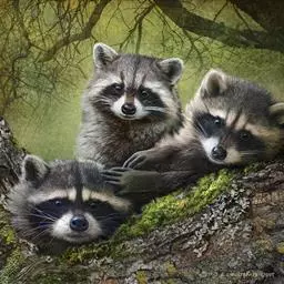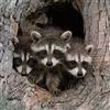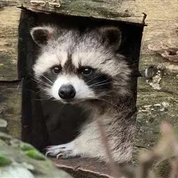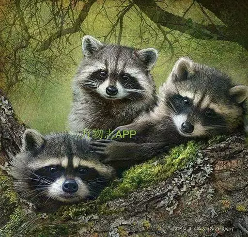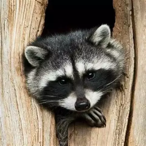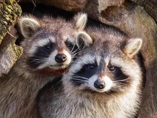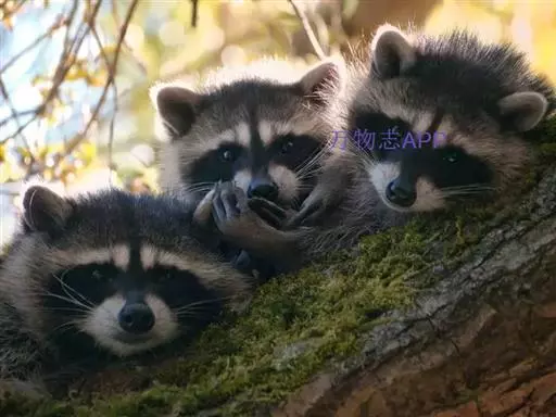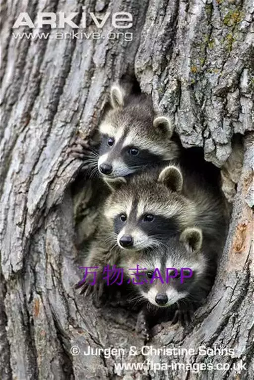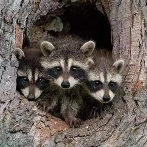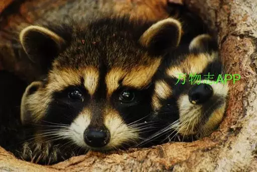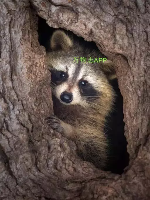 树洞里的小浣熊 浣熊只在繁殖期才会成对。公浣熊会同时与几头母熊交配,但母熊一般只接受一位求偶者。平时温驯安详的公熊在交配季节常常会互相叫嚷和厮打。