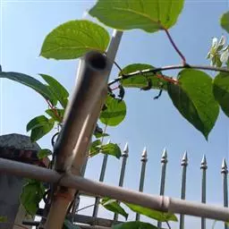 4、中华猕称猴桃为藤本果树,大树每株可挂果100千克,必须搭架支撑。搭架在落叶期间进行,强度为葡萄棚架的1.5倍。一般采用"T"形架式,架面宽1.5-2米,埋入地下0.8-1米,地上1.8-2.2米,架面上干线用10号铁丝,分支线用14号铁丝,架材间距4.5-5米,铁丝间距0.6-0.9米,以距地表面0.6米为限。