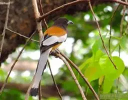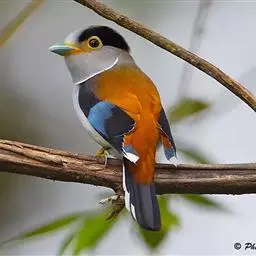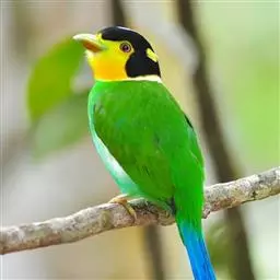 长尾阔嘴鸟是雀形目阔嘴鸟科的鸟类,体长约25厘米,是绿色阔嘴鸟。形长的楔形尾蓝色,喉及脸黄色,顶冠…