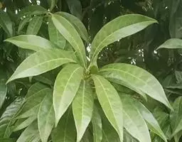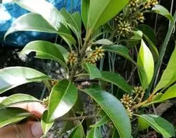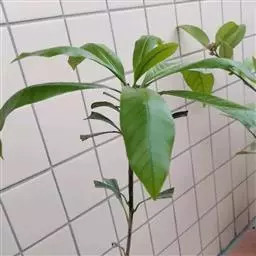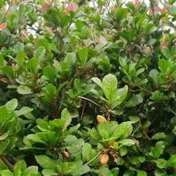 多年生常绿灌木,树高3-4.5米,枝、茎灰褐色,枝上有不规则的网线状灰白色条纹,分枝部位低,枝条数量多,若温度适合全年可抽发新梢,呈浅红色,叶枝端簇生,每簇有叶5-7片,叶互生,琵琶形或倒卵形,叶面青绿,叶背草绿,革质,长3.6-7.6厘米、宽2.7-3厘米,叶柄短、0.5厘米左右,叶脉羽状。