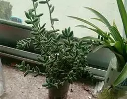 叶对生,叶片肉质,三棱线形,长3-6厘米,宽3-4毫米,具凸尖头,基部抱茎,粉绿色,有多数小点。