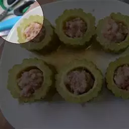 2.黄瓜切片,糯米肠用刀割开一个小口,放入花生碎。