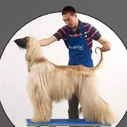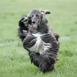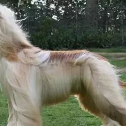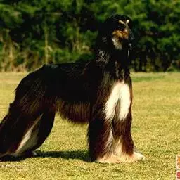 阿富汗猎犬全身披丝绢状的长毛,毛色鲜艳,呈多种颜色,背中线附近毛短,…