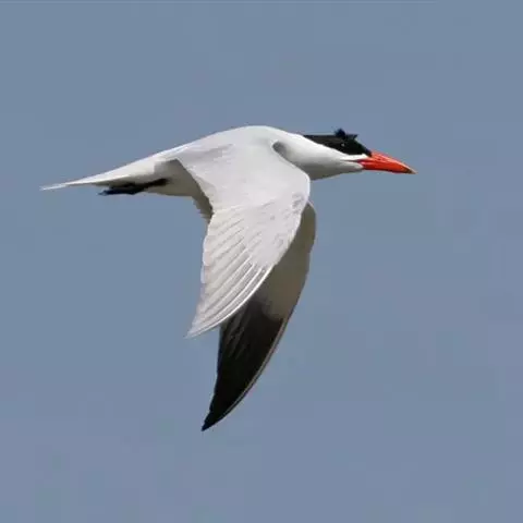 红嘴巨鸥,大型水鸟,体长47~55厘米。夏羽前额、头顶、枕和冠羽黑色。后颈、尾上覆羽和尾白色,…