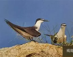 褐翅燕鸥:中型水鸟,体长360-370毫米。与乌燕鸥相似,体型稍小。额白,连接白色眉纹,…