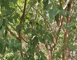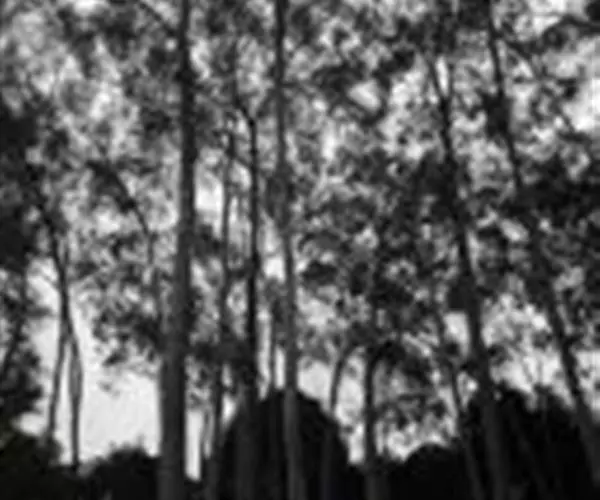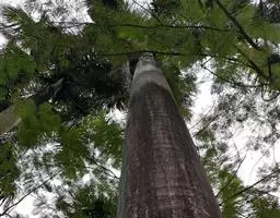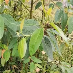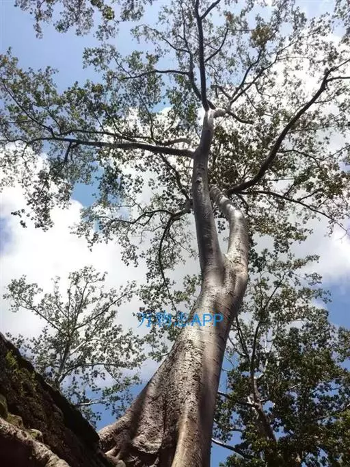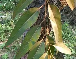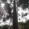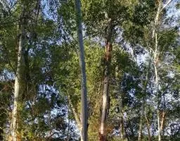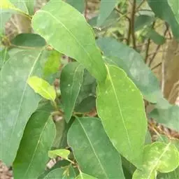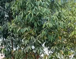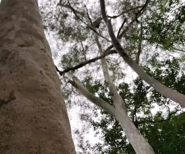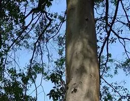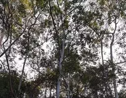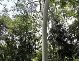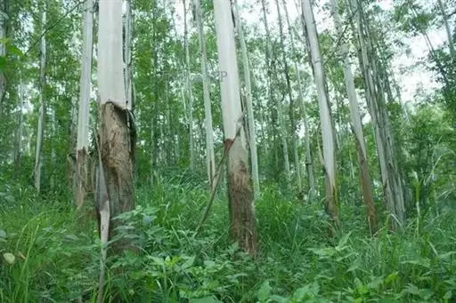 柠檬桉林 大乔木,高28m,树干挺直;树皮光滑,灰白色或红灰色,大片状脱落。幼态叶片披针形,有腺毛,基部圆形,叶柄盾状着生;成熟叶片狭披针形,宽约1cm,长10-15cm,稍弯曲,两面有黑腺点,揉之有浓厚的柠檬气味;过渡性叶阔披针形,宽3-4cm,长15-18cm;叶柄长1.5-3cm。