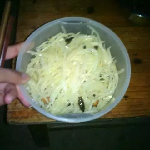 8、倒入笋丝翻炒后加水(可以用煮竹笋的水)焖2-3分钟。