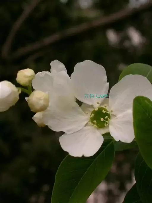 枝条细弱开展;小枝圆柱形,微有稜角,无毛;冬芽三角卵形,平滑无毛,暗紫红色。叶片椭圆形,长椭圆形至长圆倒卵形,先端圆钝或急尖稀有突尖,基部楔形或宽楔形,上下两面均无毛;叶柄短或近于无柄;总状花序无毛;花梗基部较顶部稍长,无毛;苞片小,宽披针形;花直径2.5-3.5厘米;萼筒浅钟状,无毛;花瓣倒卵形,先端钝,基部有短爪,白色;雄蕊15-20,3-4枚一束着生在花盘边缘;蒴果,倒圆锥形,无毛,有5脊,果梗长3-8毫米。花期5月,果期6-8月。