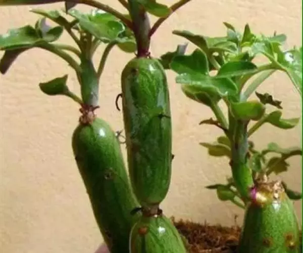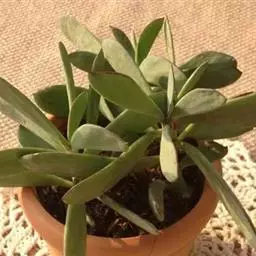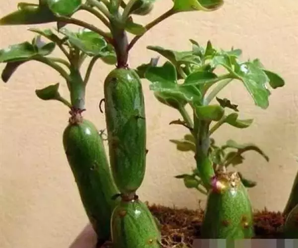 多年生落叶多浆植物。枝伸展。株高30-60cm,冠径不定。茎短圆柱状,匍匐茎上具多数短匍枝,粉蓝色,具灰色斑点,具节。叶扁平,圆形或卵形,3~5裂,叶柄与叶片等长或更长。带锦品种(Senecio articulatus ‘Variegatus’)叶片具乳白色和粉红色斑点(叶片夏季可能呈蓝绿色),不带锦品种(Senecio articulatus)植株通体呈蓝绿或翠绿。头状花序稍扁平,花小,杯状,黄色,秋季至春季开放。 七宝树 无锦品种