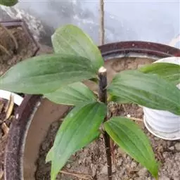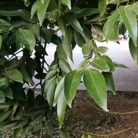 2、阴香。常绿乔木,高达20m。小枝赤褐色,无毛。叶近于对生或散生,革质,卵形或长椭圆形,长6-10cm,宽2-4cm,先端短渐尖,基部楔形至近圆形,全缘;上面绿色,有光泽,下面粉绿色,两面均无毛,具离基3出脉,脉腋内无隆起的腺体;叶柄长8-12mm。圆锥花序顶生或腋生;花小,绿白色,花被6,基部略合生,长4-5mm,两面均被柔毛;能育雄蕊9,排成3轮,外面2轮花药内向,第3轮花药外向,花药均为卵形,4室,瓣裂,花丝短,最内尚有1轮退化雄蕊;雌蕊1,子房上位,1室,1胚珠,花柱细,柱头小。浆果核果状,卵形,长不及1cm,直径约5mm,基部具肥厚杯状的宿存花被,其先端具6截形短裂片。花期3-4月。果期4-10月。