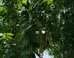 4、川桂,常绿高大乔木。枝紫灰褐色,光滑。单叶互生或近对生;革质,卵形至长卵形,长8-15cm,宽3-5cm,先端渐尖而顶点钝,基部楔状或钝形,全缘,上面绿色,无毛,下面微被白粉,幼时有白色绢状毛,后渐脱落;具离基3出脉,在下面不隆起。花小,白色,成圆锥花序或伞形花序;总花梗细长,长1-6cm,光滑或微被毛,小花梗丝状,先端渐粗,具细毛;花被6裂,内外皆疏生绢状细毛;雄蕊与雌蕊均与前种相似。浆果基部具截形之宿存萼筒,全缘。花期5-6月。果期7-10月。