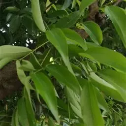 3、细叶香桂,常绿高大乔木。树皮灰色,小枝密生绢状毛。叶在新枝对生,在老枝互生,革质,卵状椭圆形至披针形,长4-14cm,宽1-6cm,先端长渐尖,基部楔形,全缘,上面绿色,有光泽,下面密生绢状短柔毛,具离基3出脉,在背面显着隆起。圆锥花序腋生;总花梗和花梗密生白色短柔毛;花淡黄色,花被6裂,基部筒状;雄蕊、雌蕊与前种相似。浆果椭圆形,基部具宿存萼筒,全缘。花期5-6月。果期6-12月。