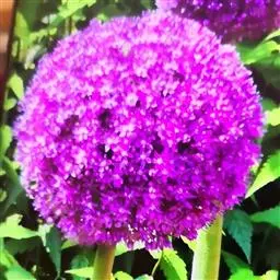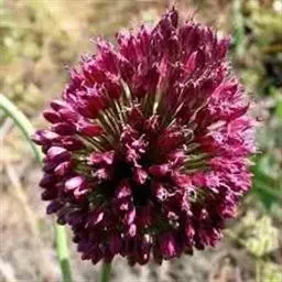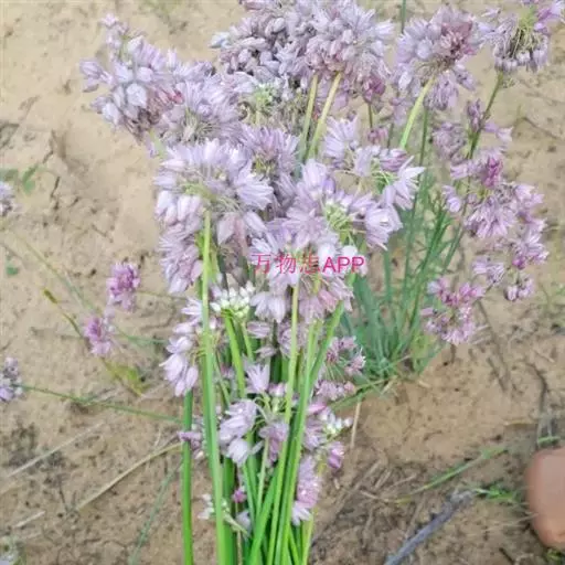 花葶圆柱状,高10-30厘米,下部被叶鞘;总苞单侧开裂,宿存;伞形花序半球状至球状,具多而通常密集的花;小花梗近等长,从与花被片近等长直到比其长1倍,基部无小苞片;花淡红色、淡紫色至紫红色,大;花被片卵状矩圆形,长6-9毫米,宽3-5毫米,先端钝圆,内轮的常比外轮的长;花丝近等长,为花被片长度的1/2-2/3,基部合生并与花被片贴生,内轮的基部约1/2扩大成卵形,外轮的锥形;子房倒卵状球形;花柱略比子房长,不伸出花被外。