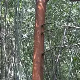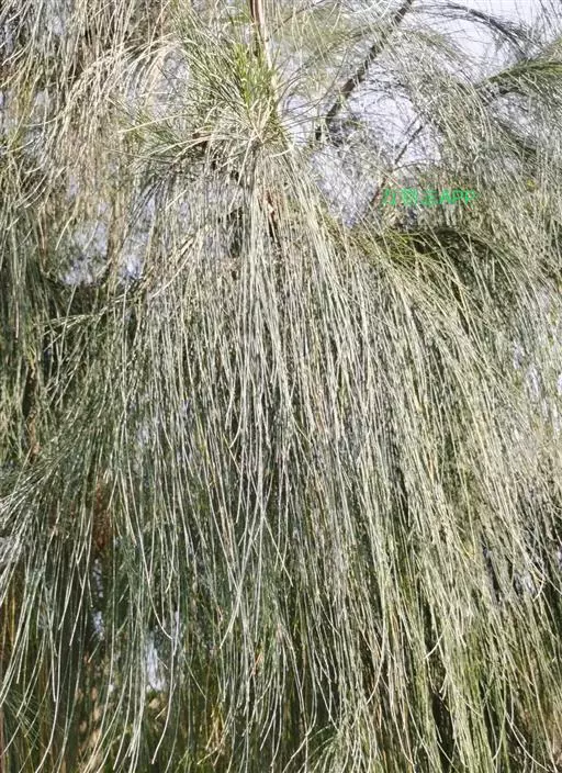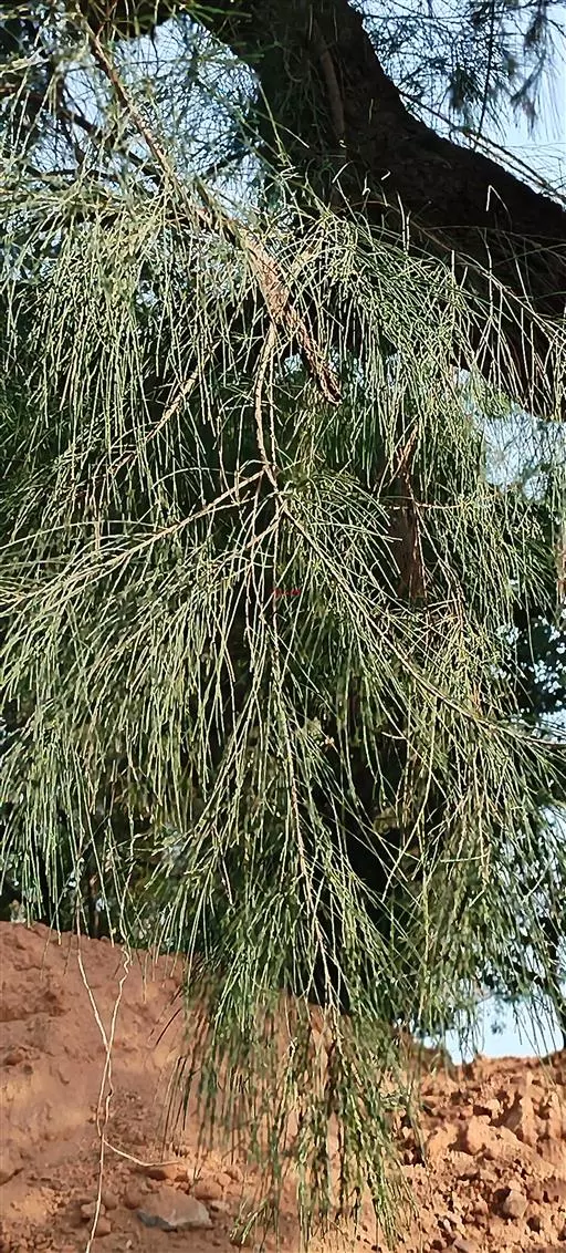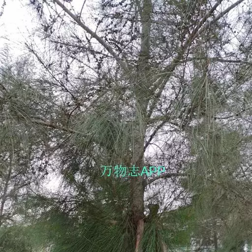 木麻黄 乔木,高可达30m,大树根部无萌蘖;树干通直,直径达70cm;树冠狭长圆锥形;树皮在幼树上的赭红色,较薄,皮孔密集排列为条状或块状,老树的树皮粗糙,深褐色,不规则纵裂,内皮深红色;枝红褐色,有密集的节;最末次分出的小枝灰绿色,纤细,直径0.8-0.9mm,长10-27cm,常柔软下垂,具7-8条沟槽及棱,初时被短柔毛,渐变无毛或仅在沟槽内略有毛,节间长(2.5-)4-9mm,节脆易抽离。