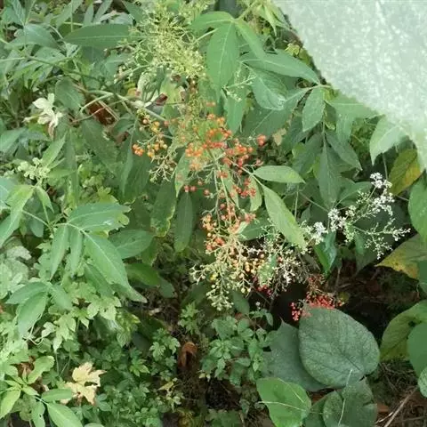 血满草,又名血莽草、大血草。多年生高大草本或半灌木,高1-2米;根和根茎红色,折断后流出红色汁液。茎草质,具明显的棱条。羽状复叶具叶片状或条形的托叶;小叶3-5对,长椭圆形、长卵形或披针形,长4-15厘米,宽1.5-2.5厘米,先端渐尖,基部钝圆,两边不等,边缘有锯齿,上面疏被短柔毛,脉上毛较密,顶端一对小叶基部常沿柄相连,有时亦与顶生小叶片相连,其他小叶在叶轴上互生,亦有近于对生;小叶的托叶退化成瓶状突起的腺体。聚伞花序顶生,伞形式,长约15厘米,具总花梗,3-5出的分枝成锐角,初时密被黄色短柔毛,多少杂有腺毛;花小,有恶臭;萼被短柔毛;花冠白色;花丝基部膨大,花药黄色;子房3室,花柱极短或几乎无,柱头3裂。果实红色,圆形。花期5-7月,果熟期9-10月。