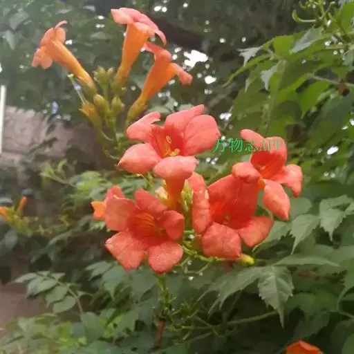 借气生根攀援它物向上生长,羽状复叶,小叶卵形,边缘有锯齿,花鲜红色,花冠漏斗形,结蒴果,喜欢排水良好土壤,较耐水湿、并有一定的耐盐碱能力。