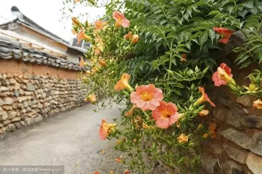 凌霄花为藤本植物,喜攀援,是庭院中绿化的优良植物,用细竹支架可以编成各种图案,非常实用美观。也可通过整修制成悬垂盆景,或供装饰窗台晾台等用。