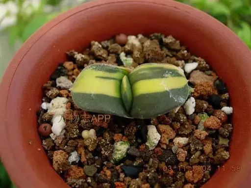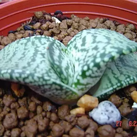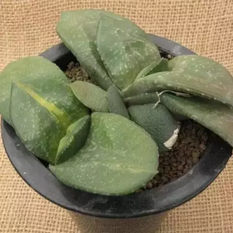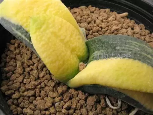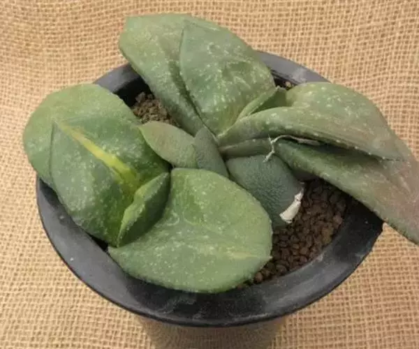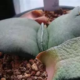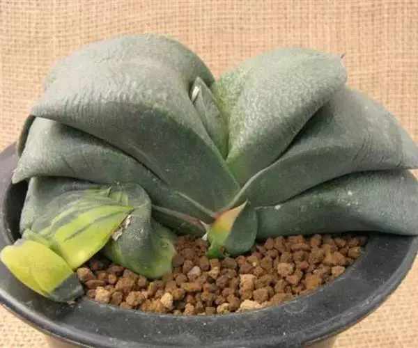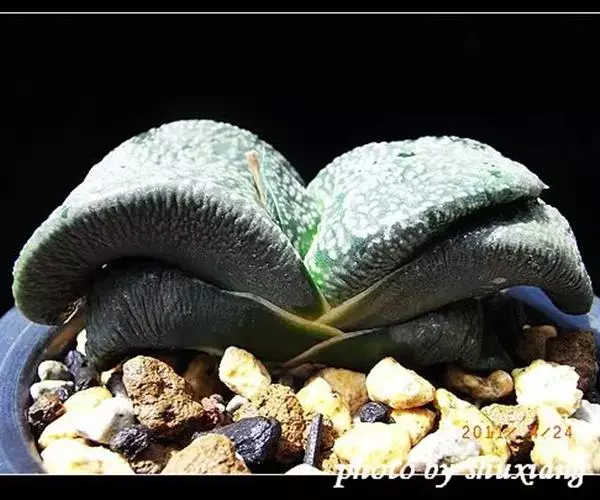 幼株叶两列叠生,肉质厚,长3~5厘米、宽3厘米。叶舌状,先端有尖,表皮有白色小疣,叶缘和叶尖都有小疣。成年株叶排列成莲座状,直径6~10厘米,单叶长5~6厘米、宽3~4厘米、厚1厘米,叶尖背面有明显的龙骨突,部分叶表面小疣脱落。