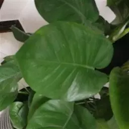 叶片呈两型性,幼叶为单叶,箭形或戟形;老叶成5-9裂的掌状叶,中间一片叶大型, 叶基裂片两侧常着生小型耳状叶片。初生叶色淡,老叶呈深绿色,且叶质加厚。合果芋的叶的颜色在地上的时候是白色的,当它攀附到树上的时候,它的颜色就会变深变绿。叶的形状也会随着改变,在地上的时候,叶的形状是盾形的,随着植株攀附到树上,叶的分裂也会随着增加,它可以分裂到七八片之多,叶的颜色变深变绿,在树干上的它新发出来的小叶颜色也没有发白,小叶分裂的很多,而且在同一植株上,树干基部的合果芋的叶片不分裂,在树干中部的叶片才开始分裂。这种同一植株上有不同叶形的现象叫做异形叶性。异形叶性的发生,有两种情况:一种是叶因枝的老幼不同而叶形各异,另一种是由于外界环境的影响而引起异形叶性。