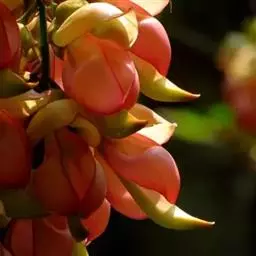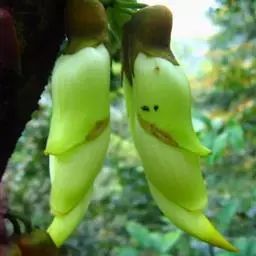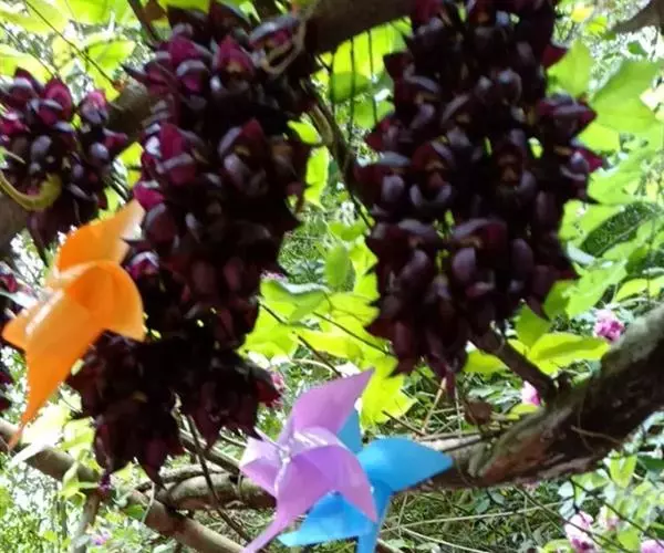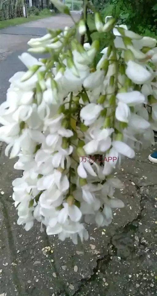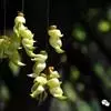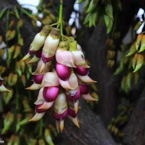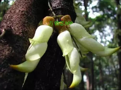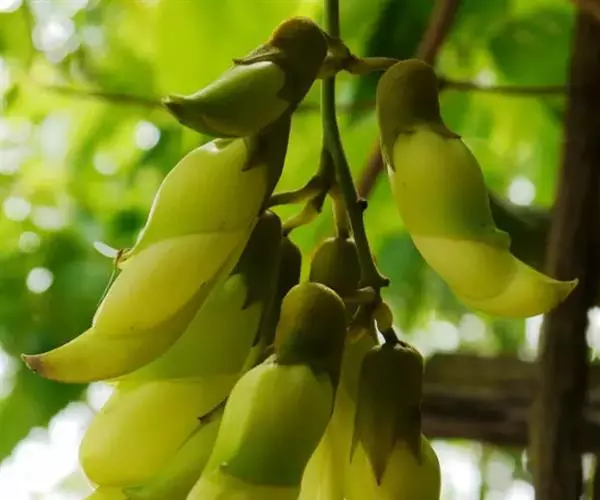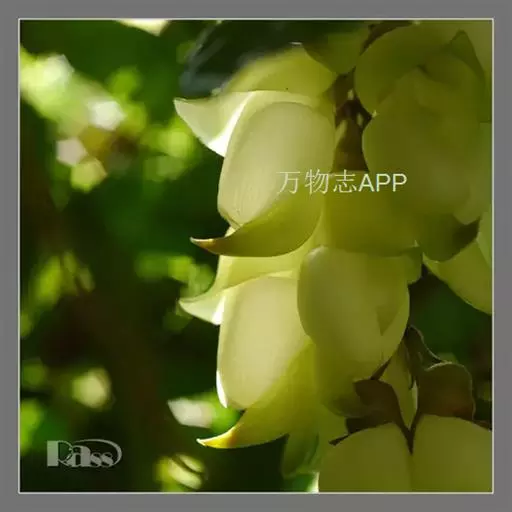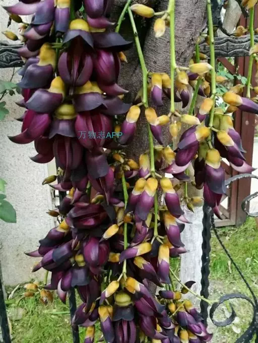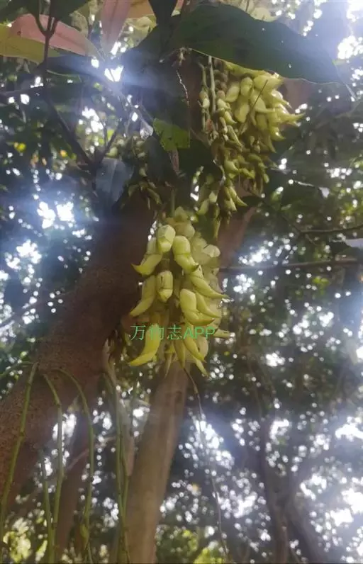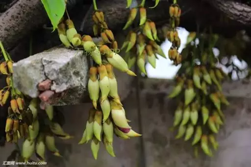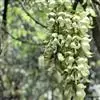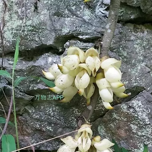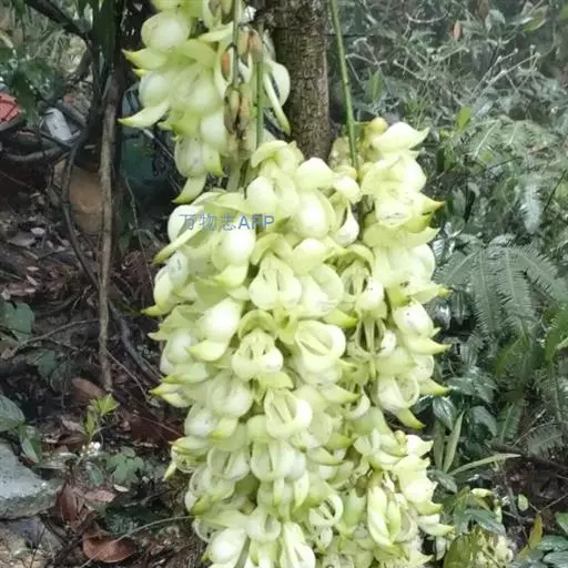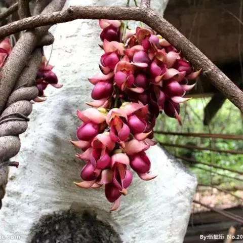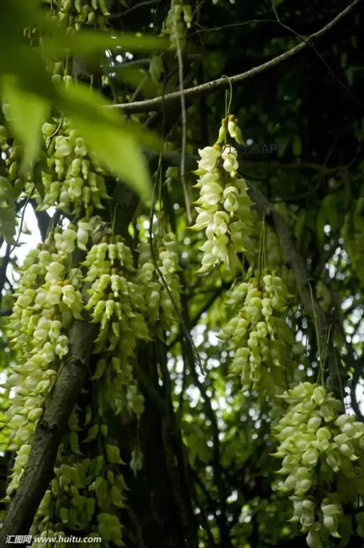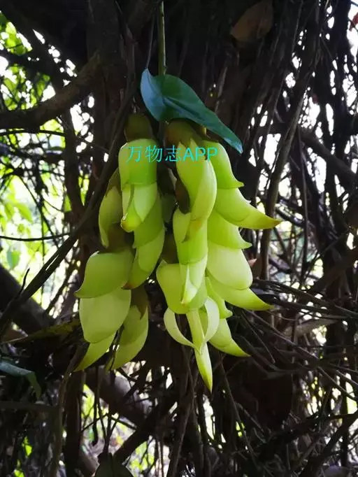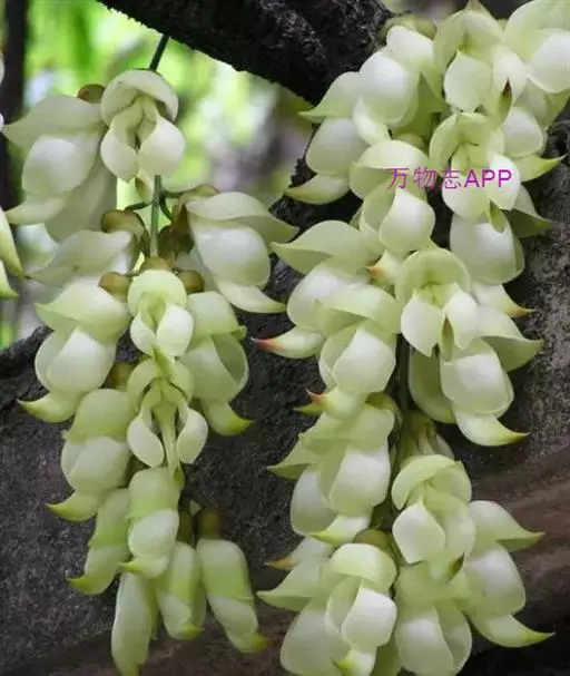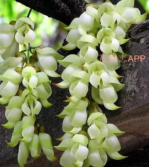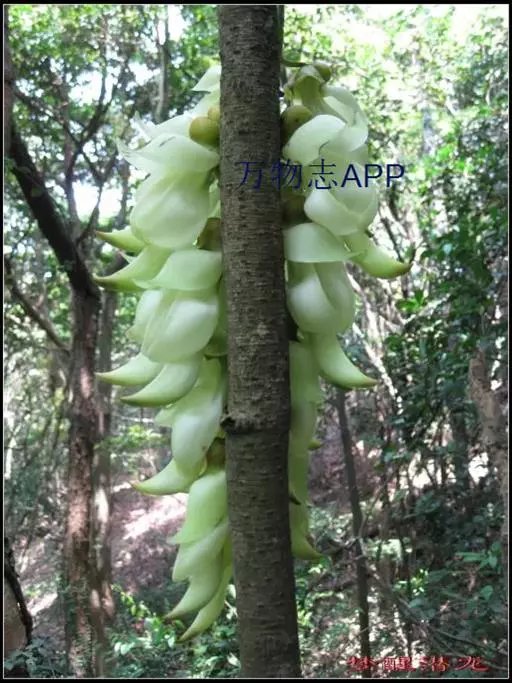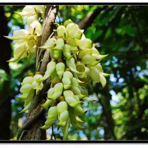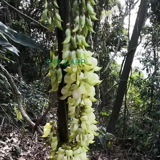 白花油麻藤(Mucuna birdwoodiana Tutcher),蝶形花科黎豆属,又名禾雀花、常绿木质大型藤本。该种生长迅速,蔓茎粗壮,叶繁荫浓,茎长可达30米以上,其生命力顽强,能盘树缠绕,越冠飞枝,攀石穿缝。其花序悬挂于悠长盘曲的老茎上,吊挂成串,每串二、三十朵,串串下垂。酷似无数白中带翠,如玉温润的小鸟栖息在枝头。