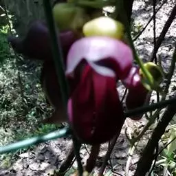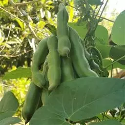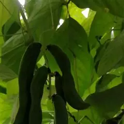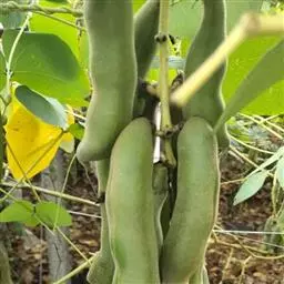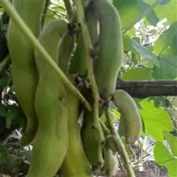 果木质,带形,长30-45厘米,宽3.5-4.5厘米,厚1-1.5厘米,近念珠状,密被红褐色短绒毛,幼果常被红褐色脱落的刚毛,沿背、腹缝线各具宽3-5毫米的木质狭翅,有纵沟,内部在种子之间有木质隔膜,厚达4毫米;种子5-13颗,深紫黑色,近肾形,长约2.8厘米,宽约2厘米,厚8-10毫米,常有光泽,种脐为种子周长的1/2-3/4。花期4-6月,果期6-11月。