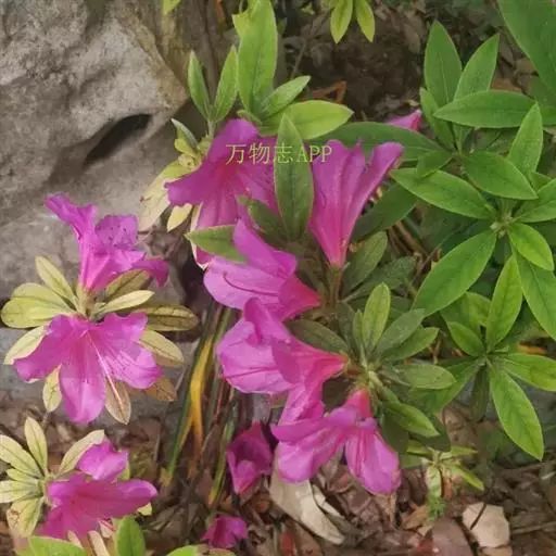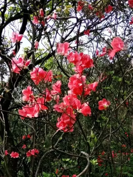 杜鹃花,又名映山红、山石榴,为常绿或平常绿灌木。相传,古有杜鹃鸟,日夜哀鸣而咯血,染红遍山的花朵,因而得名。杜鹃花一般春季开花,每簇花2-6朵,花冠漏斗形,有红、淡红、杏红、雪青、白色等,花色繁茂艳丽。生于海拔500-1200(-2500)米的山地疏灌丛或松林下,为中国中南及西南典型的酸性土指示植物,有时杜鹃花也是杜鹃属约960种植物的通称。