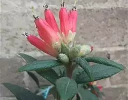 花芽卵球形,鳞片外面中部以上被糙伏毛,边缘具睫毛。花2-3(-6)朵簇生枝顶;花梗长8毫来,密被亮棕褐色糙伏毛;花萼5深裂,裂片三角状长卵形,长5毫米,被糙伏毛,边缘具睫毛;花冠阔漏斗形,玫瑰色、鲜红色或暗红色,长3.5-4厘米,宽1.5-2厘米,裂片5,倒卵形,长2.5-3厘米,上部裂片具深红色斑点;雄蕊10,长约与花冠相等,花丝线状,中部以下被微柔毛;子房卵球形,10室,密被亮棕褐色糙伏毛,花柱伸出花冠外,无毛。