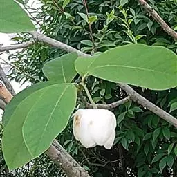 落叶常绿乔木,在原产地高达30米;树皮淡褐色或灰色,薄鳞片状开裂;小枝粗壮,具横隔的髓心;小枝、芽、叶下面,叶柄、均密被褐色或灰褐色短绒毛(幼树的叶下面无毛)。叶厚革质,椭圆形,长圆状椭圆形或倒卵状椭圆形,长10-20厘米,宽4-7(10)厘米,先端钝或短钝尖,基部楔形,叶面深绿色,有光泽;侧脉每边8-10条;叶柄长1.5-4厘米,无托叶痕,具深沟。花白色,有芳香,直径15-20厘米;花被片9-12,厚肉质,倒卵形,长6-10厘米,宽5-7厘米;雄蕊长约2厘米,花丝扁平,紫色,花药内向,药隔伸出成短尖;雌蕊群椭圆体形,密被长绒毛;心皮卵形,长1-1.5厘米,花柱呈卷曲状。聚合果圆柱状长圆形或卵圆形,长7-10厘米,径4-5厘米,密被褐色或淡灰黄色绒毛;蓇葖背裂,背面圆,顶端外侧具长喙;种子近卵圆形或卵形,长约14毫米,径约6毫米,外种皮红色,除去外种皮的种子,顶端延长成短颈。花期5-6月,果期9-10月。