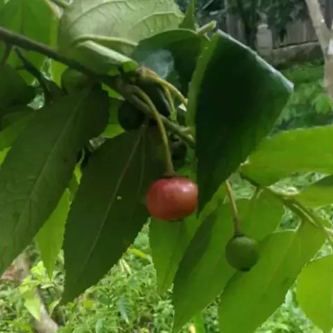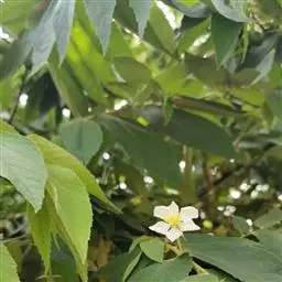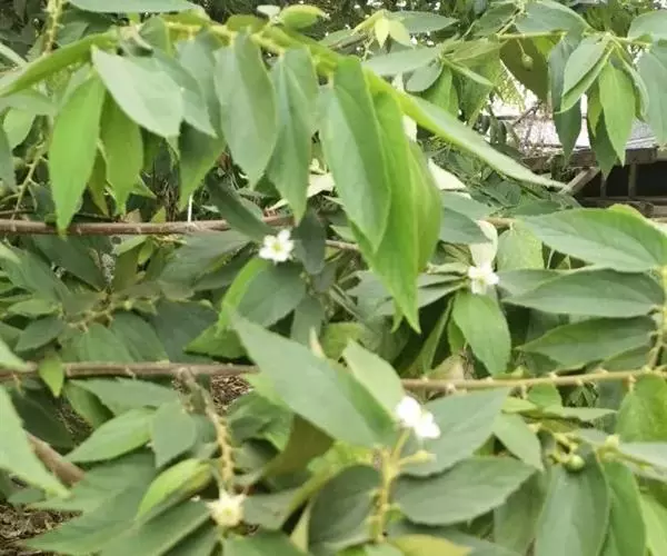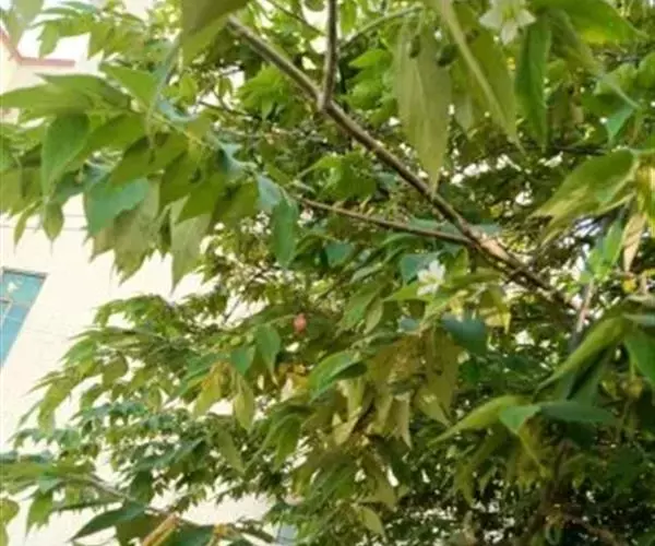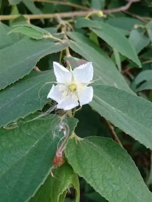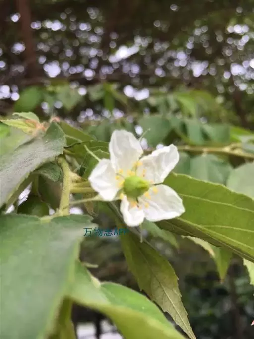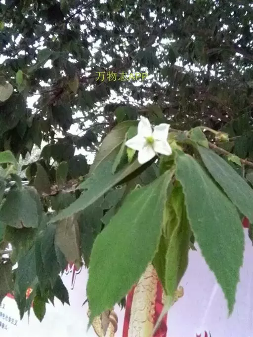 常绿小乔木,高达5~8m。树皮光滑较薄,灰褐色。小枝及叶被短腺毛,叶片纸质,单叶互生,长圆状卵形,长4~10cm,宽1.5~4cm。掌状,先端渐尖,基部斜心形,3~5主脉,叶缘中上部有疏齿,粮棉油星状绒毛。花两性,单生或成对着生于上部小枝的叶腋花萼合生,萼片5枚,分离,长10~12mm,宽约3mm,两侧边缘内折而成舟状,先端有长尾尖,开花时花萼反折。花期长,花瓣5枚,白色,倒阔卵形,具有瓣柄,全缘。先端边缘波状,长10~11mm,宽约9mm,雄蕊多数,子房无毛,5~6室, 每室有胚珠多枚。柱头 5~6 浅裂, 宿存。花盘杯状。盛花期3~4月,周年有果成熟,6~8月为果熟期。果实多汁浆果,球形或近球形,直径约1cm。成熟时为红色,无毛,内含种子。种子椭圆形,极细小 。