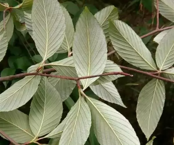 乔木,高达10米;小枝圆柱形,具少数皮孔,黑褐色,幼时被白色绒毛;冬芽卵形,先端急尖,外具数枚褐色鳞片。叶片卵形至椭圆卵形,长5-8厘米,宽2-3.5厘米,先端急尖或短渐尖,基部宽楔形或圆形,边缘有细锯齿或在新枝上的叶片有重锯齿和浅裂片,上面深绿色,无毛,下面密被白色绒毛,中脉和侧脉上也具绒毛,侧脉通常8-15对,直达叶边锯齿顶端;叶柄长5-15毫米,密被白色绒毛。