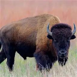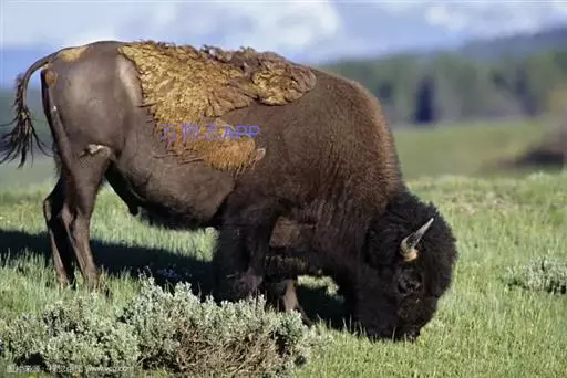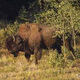美洲野牛,学名:Bison bison (Linnaeus, 1758);英文名:American bison),牛科美洲野牛属的一种动物。又名美洲水牛或犎牛,是北美洲体型最大的哺乳动物和世界上最大野牛之一。也是一种比较凶悍的动物,体重可达1000千克,头上长有一对向上弯曲锋利的双角,即使面对最富攻击性的捕食动物,也毫不退缩。它们长有深暗的栗子褐色毛发,有如同小丘一样的大肩膀。在种群之内,各自的公牛形成一个集体并保卫族群中的母牛,在6-9月期间是美洲野牛的繁殖期。每头母牛每年能诞生一头小牛。