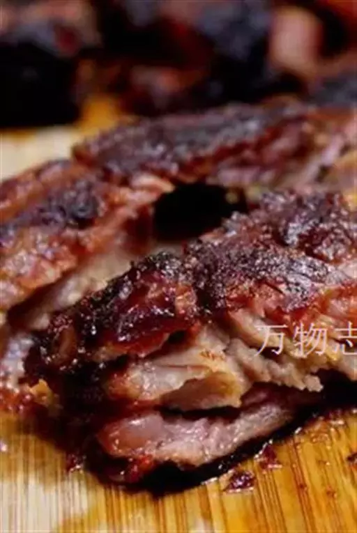 4、从炉口封闭时算起,过45分钟烤肉既熟,掀开大锅,抬出烤肉挂起,用刀刮去猪皮上焦糊的外层,而后取肉切成薄片即可食用。