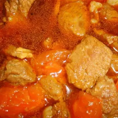 1、菜油烧热,下辣椒粉、茴香和大蒜片炒出香味来,下牛肉块炒至变色。加水和盐烧开,改小火炖约一小时。