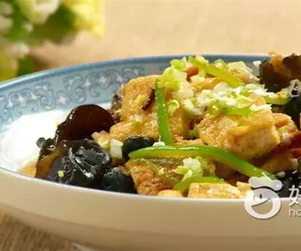 豆腐500克,木耳50克,葱末、姜末、火腿、盐、花生油、水淀粉、鲜汤各适量。