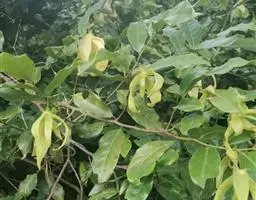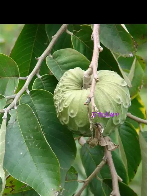 毛叶番荔枝(Annona cherimolia Mill.)番荔枝科落叶小乔木,高4-5米;枝条被短柔毛。叶薄纸质,卵圆形、少数为椭圆形,顶端钝或短渐尖,基部圆形,叶面被短柔毛,叶背被短绒毛。花单生或2-3朵与叶对生;总花梗被茸毛;外轮花瓣长圆状线形,外面绿黄色或红色,被短柔毛,内面浅黄色或带白色,基部有紫色斑点,内轮花瓣鳞片状,肉红色或紫色。果实圆锥状或心脏形,有时圆球状或卵圆状,果皮有各式凹凸状;果肉白色,与种子易于分离,味甜酸;种子倒卵形,略扁,顶端斜截形。