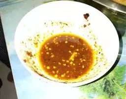 3、准备调料,干性香料不必太多。杯子里面黄黄的生姜汁,这个用鲜姜就可以了,我做糖醋子姜腌出的汁儿,正好用上了。上等酿造醋15克,生抽5克,盐4克,(开锅后还可以调整味道)糖10克。