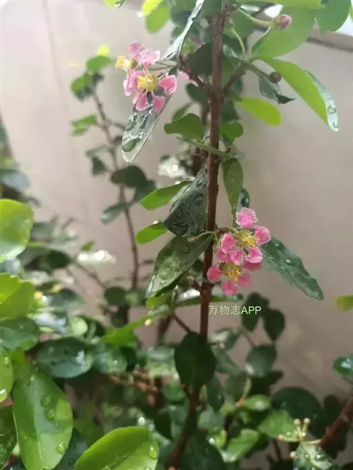 直立灌木,高约1米;嫩枝被乳突状小毛,老枝无毛。叶小,对生,革质,卵圆形至倒卵形,长6-15(-20)毫米,宽5-12(-15)毫米,先端圆形或截头状微凹,基部圆形或钝,叶面绿色,无毛,背面苍白色或淡褐色,边缘有刺状疏齿,或有时全缘;叶柄长0.5-1毫米;托叶针状,长约1毫米。花组成腋生的聚伞花序,或仅单花生于叶腋;花直径约1厘米,花梗纤细,四棱形,长于叶,中部以下具关节,有小苞片2;萼片5,卵状长圆形,外有大的腺体2枚,基部与花梗相接处被疏毛;花瓣5,初时淡红色,后变白色,长约8毫米,具长柄;雄蕊10,长约为花瓣的一半;子房无毛,花柱3,分离,但仅2枚发育,弯曲,柱头膨大。核果鲜红色,近球形,直径约8毫米。花期夏秋 。
