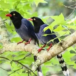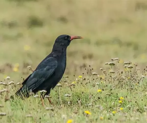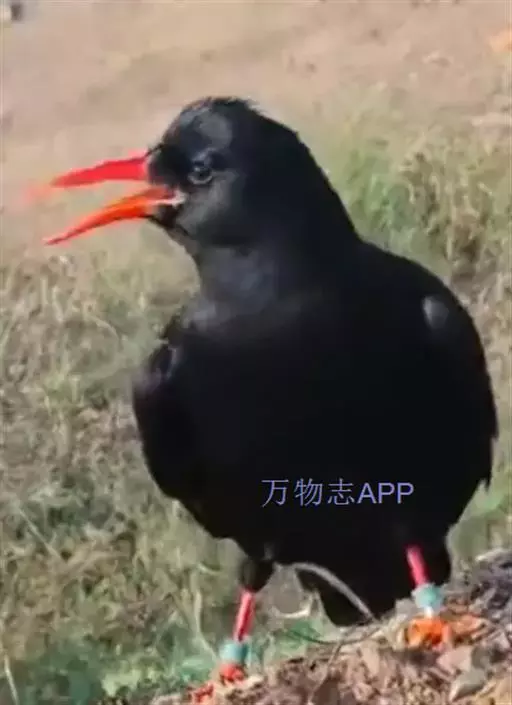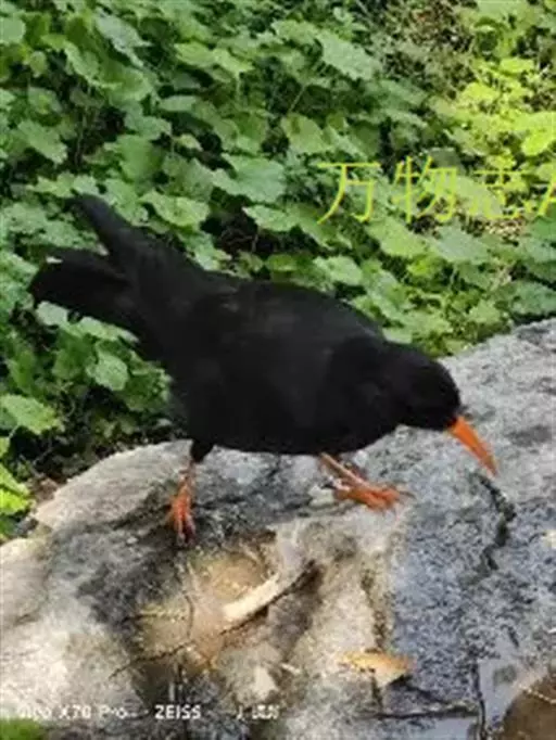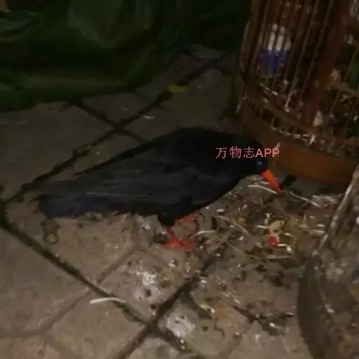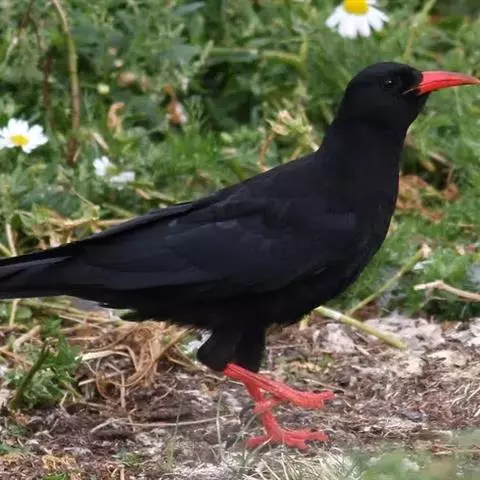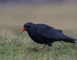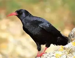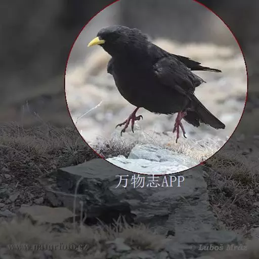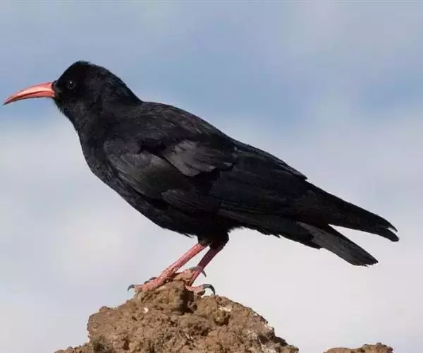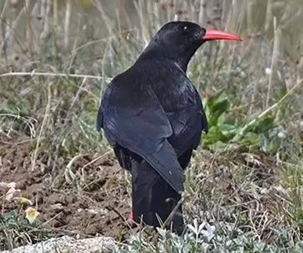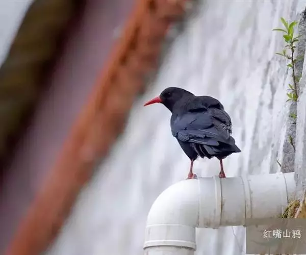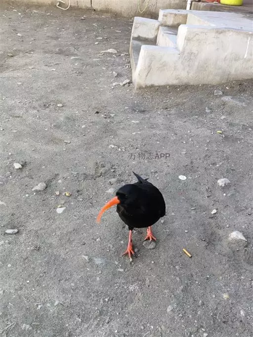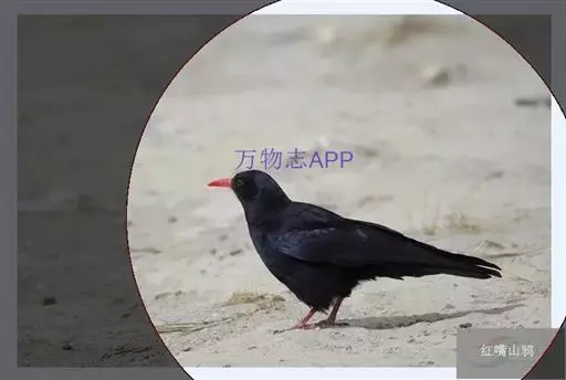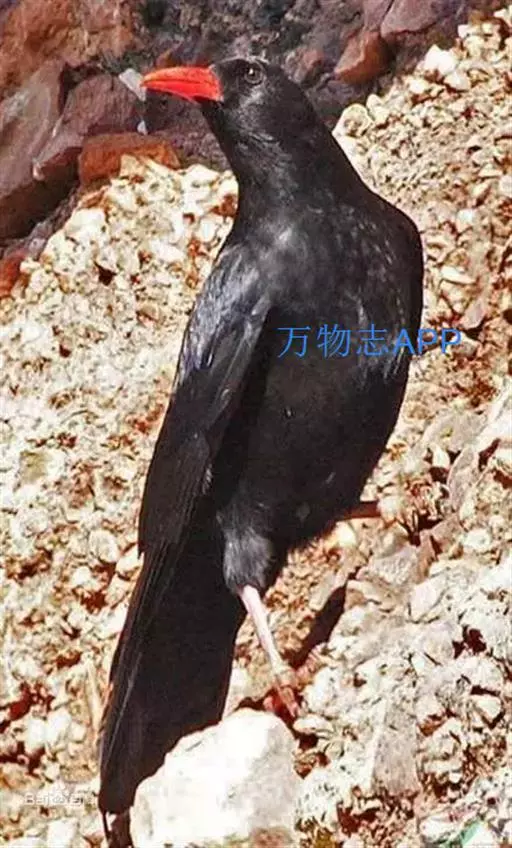 红嘴山鸦(学名:Pyrrhocorax pyrrhocorax): 大型鸦类,体长36-48厘米。嘴、脚红色,通体黑色具蓝色金属光泽。雌雄羽色相似,全身羽毛纯黑色具蓝色金属光泽。两翅和尾纯黑色具蓝绿色金属光泽。虹膜褐色或暗褐色,嘴和脚朱红色。相似种黄嘴山鸦嘴为黄色而不为红色,野外不难区别。