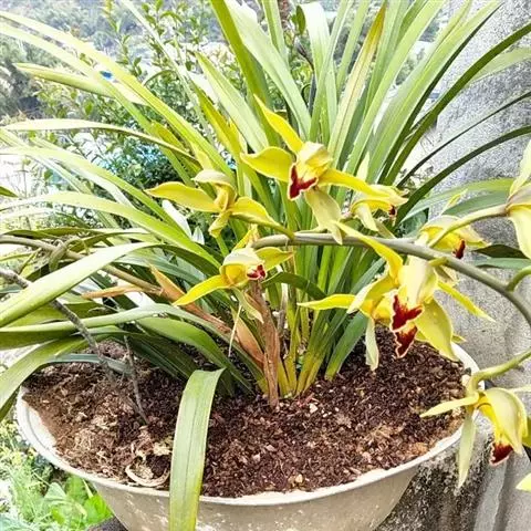 上盆(或翻盆)时间一般在春季3-4月或秋季10-11月。花盆以口小、盆深、底孔大的为佳。新从山上挖来的野生苗需理植于瓦盆(泥盆)中,这样兰花泥易干,通气性好.容易发根;2-3年后方可换人紫砂盆或瓷盆。兰花种植(在盆中)的方法与一般花卉不同,尤其是名种兰花,翻种移盆必须洗根。方法足将根浸入清水中,用旧牙刷或毛笔轻轻洗刷,切勿用力过大伤根;用剪刀将残叶、黄叶、断裂根、发黑腐烂根剪去,注意勿伤幼芽。然后将处理好的植株放在阴凉通风处晾干,待根部发白并显细小皱纹柔软时,再植入盆中。