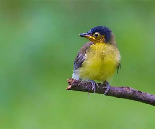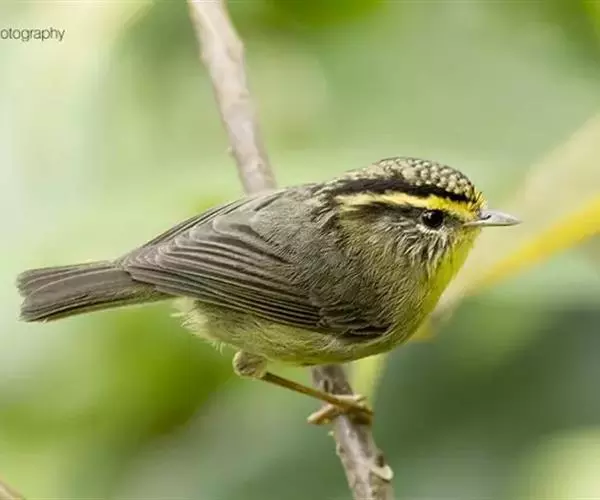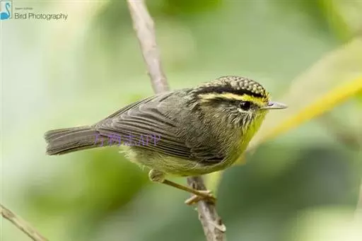 雌雄羽色相似。额、头顶至枕浅黄色或灰绿色,各羽均具黑色羽缘在头顶形成黑色鳞状斑或浅黄色纵纹。头顶两侧各有一条宽的黑色侧冠纹,从额基一直延伸到后颈,其终端在上背形成若干黑色纵纹。在黑色侧冠纹下面有一条长而宽阔的淡黄色眉纹,从嘴基一直到后枕侧。贯眼纹黑色、颊淡黄色,羽端缀黑色,耳覆羽呈黑色与灰色或黑色与灰黄色相杂状。上体灰橄榄绿色,两翅和尾亦为灰橄榄绿色,羽缘浅黄色。颏、喉和其余下体淡黄色,颈侧和两胁缀橄榄色。
