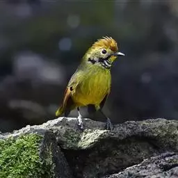 斑喉希鹛小型鸟类,体长14~17厘米。头具羽冠,前额和头顶羽冠金黄褐色,头侧灰黄色具黄色眼圈。…
