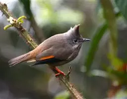 栗耳凤鹛,雌雄羽色相似。额、头顶至枕灰色,头顶有一短的不甚明显的羽冠,…